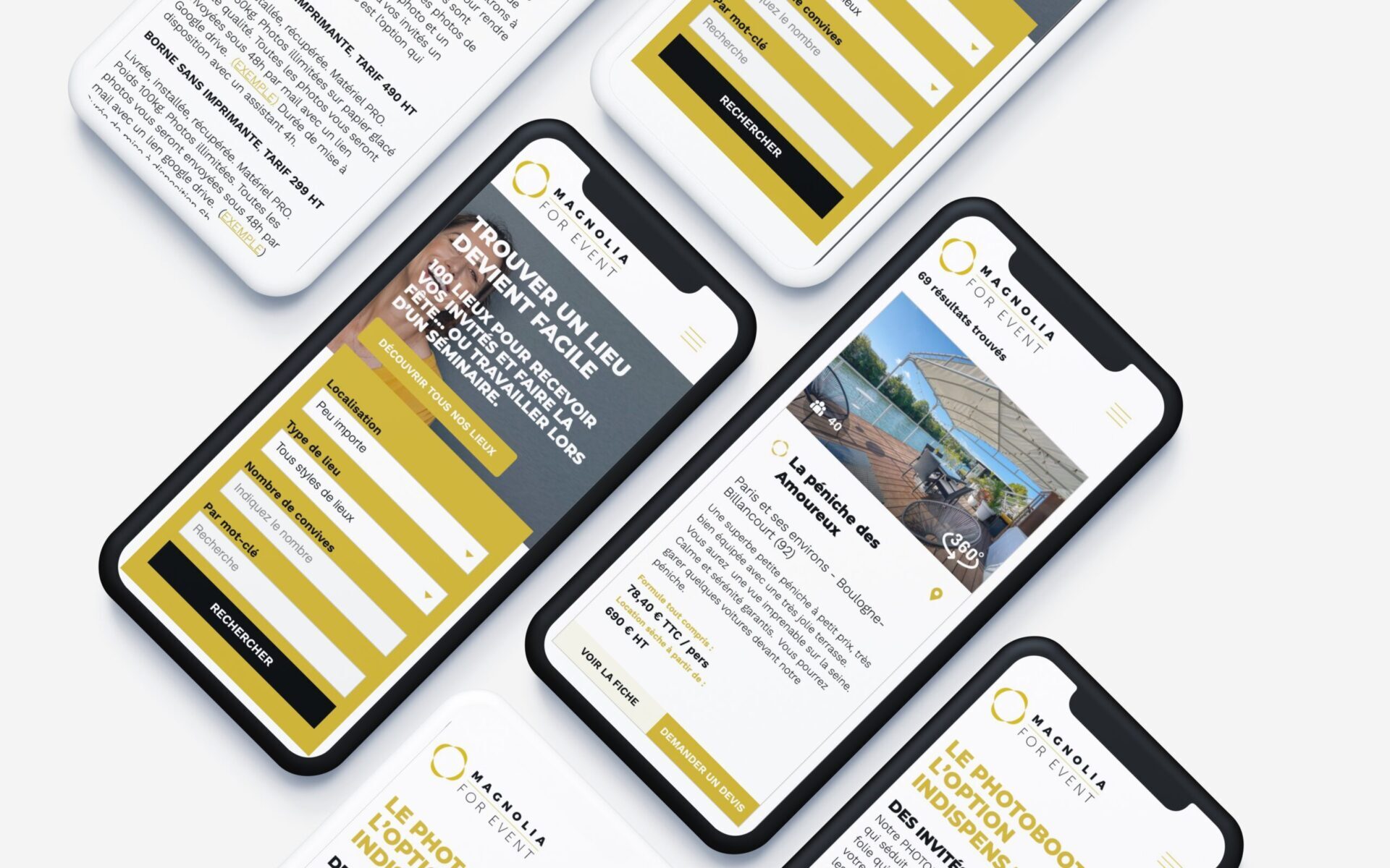 Avec son nouveau design mobile-first, le site Magnolia For Event a revu entièrement sa structure pour une navigation simplifiée sur smartphone.Rendre la recherche accessible dès la zone de flottaison quel que soit le terminal (mobile ou desktop) a été le challenge absolu. Autre nouveauté : un menu de navigation header fixe (sicky) accompagne l’utilisateur au scroll de la page.
